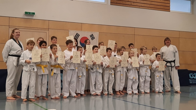 21 Kinder im Alter von 6 bis 13 Jahren wurden von den beiden Prüfern Melina und Jochen Martin zum 9., 8. und 7. Kup (halb-gelber, gelber und halbgrüner Gürtel) geprüft.